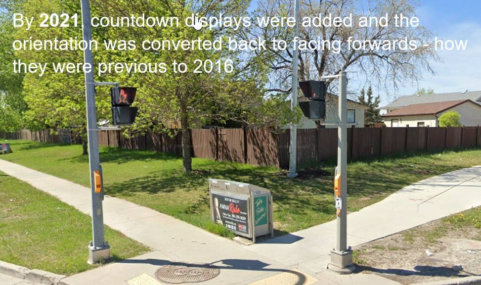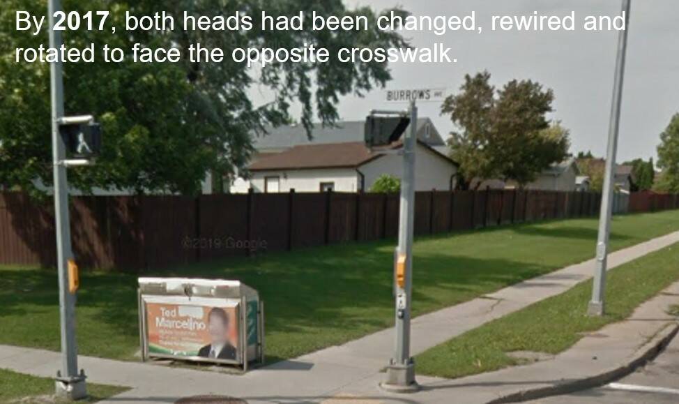 In the years since, work crews have gone back and reversed the work at many intersections, flipping the pedestrian heads to face the same direction as the traffic lights once again.