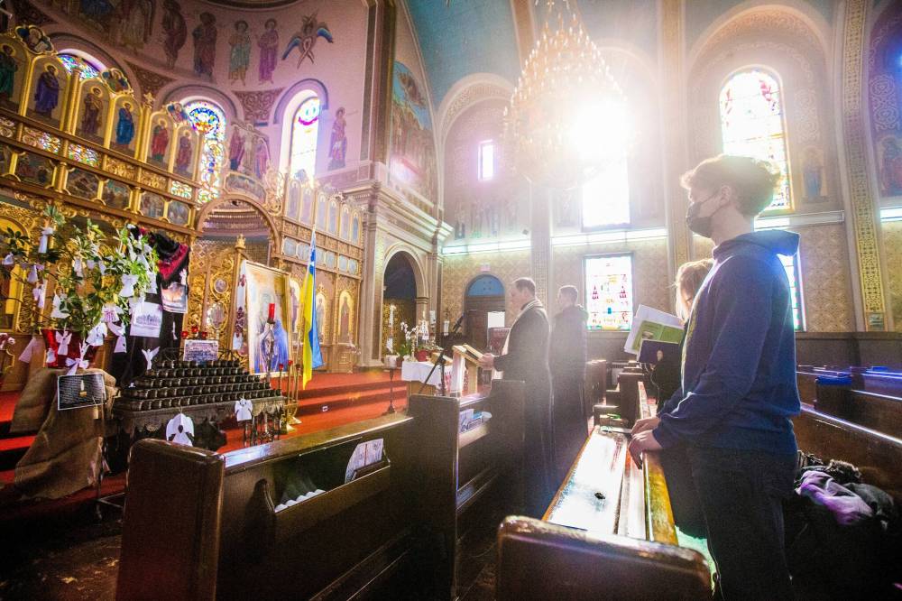 On Thursday afternoon, he led a group of three in prayer, speaking Ukrainian in low tones, facing the ornate Byzantine altar of gold as light shone through the stained-glass windows adorned with saints. Eventually, a parishioner took his place, singing toward the altar.