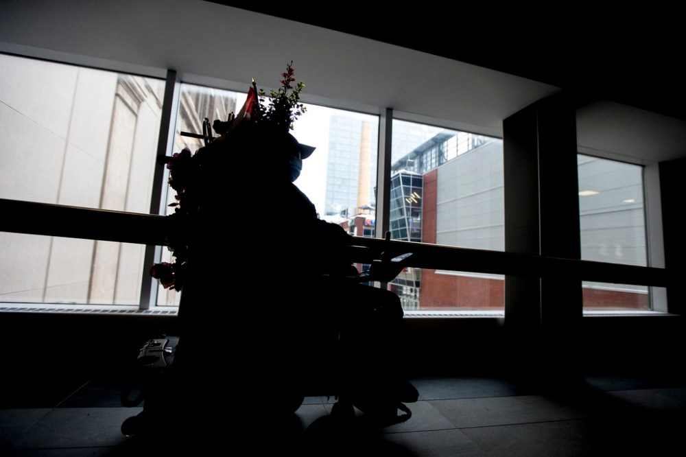 A fixture in the skywalk network, the woman is beloved and known for playing music on a keyboard and decorating her wheelchair based on the season – tinsel and Christmas ornaments in December and bunches of flowers as spring approaches.