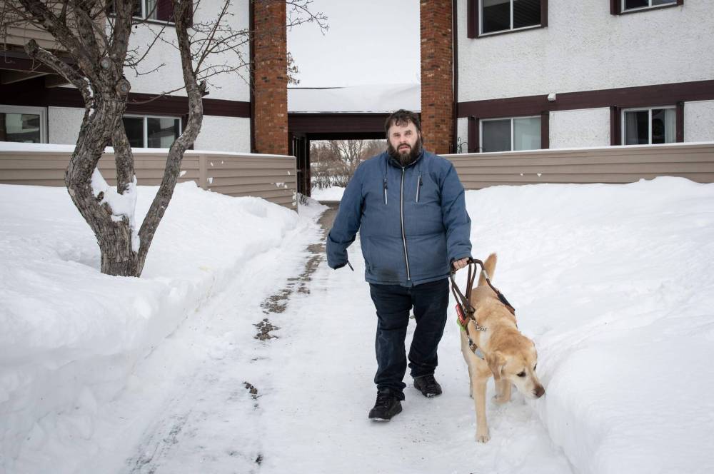 Brian Thorkelson inched his foot forward through the mound of snow on the sidewalk. Had he not lived there in the summer, he might not have known there was a sidewalk. His guide dog hesitated.