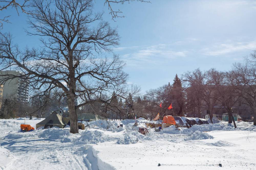 On March 9, the province partly tore down the camp. It said it took action because people were living in a public space. The minister in charge of government services later said legislative staff had determined the camp was empty.