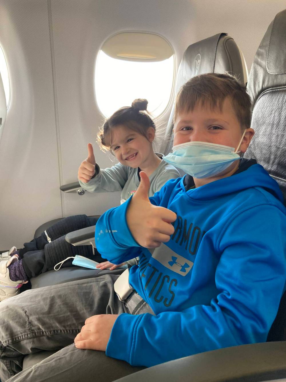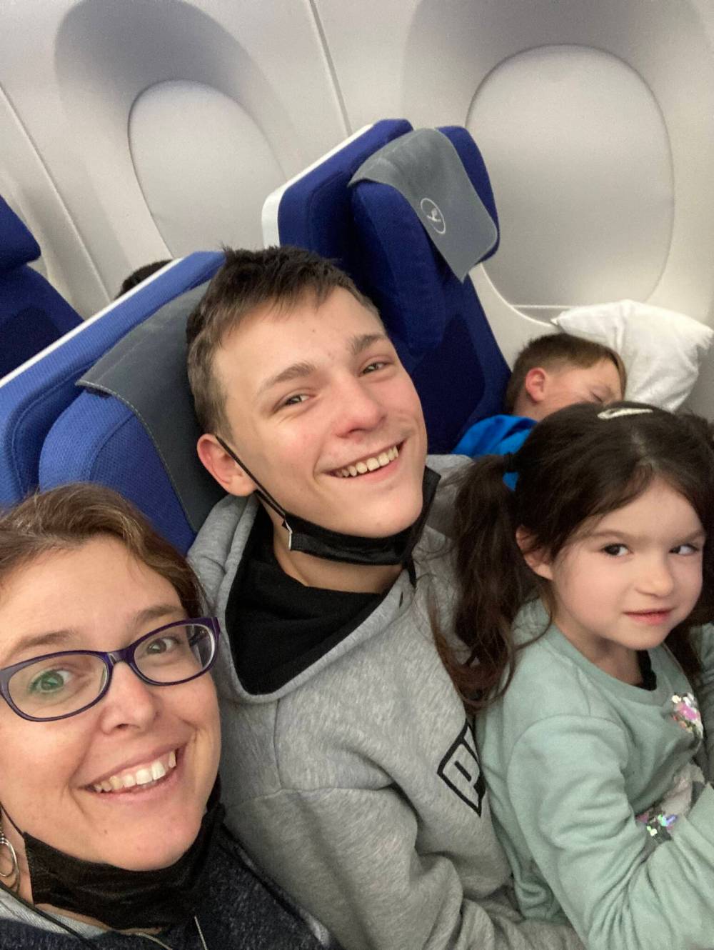 Trish Braun with Daniel (from left), Paige and Lewis on their way home. Braun made a solo trip to southern Ukraine in January to pick up Daniel, Lewis and Paige, and stay together as they waited for Canada to approve the children’s visas and passports.