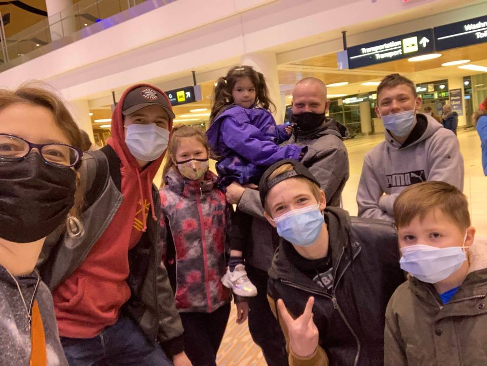 Trish and Mike Braun with six of their eight children, Nash, Quinn, Paige, Daniel, Pierce and Lewis, after she and the family’s three newest members arrived at Winnipeg’s airport earlier in February.