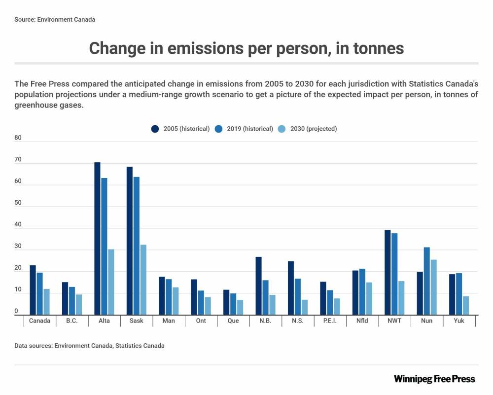 A Free Press analysis suggests the average Manitoban’s emissions could amount to 12.6 tonnes per year by 2030. That would move the keystone province from having below-average emissions per capita in both 2005 and 2019, to being slightly worse than a national average of 11.9 tonnes per person.