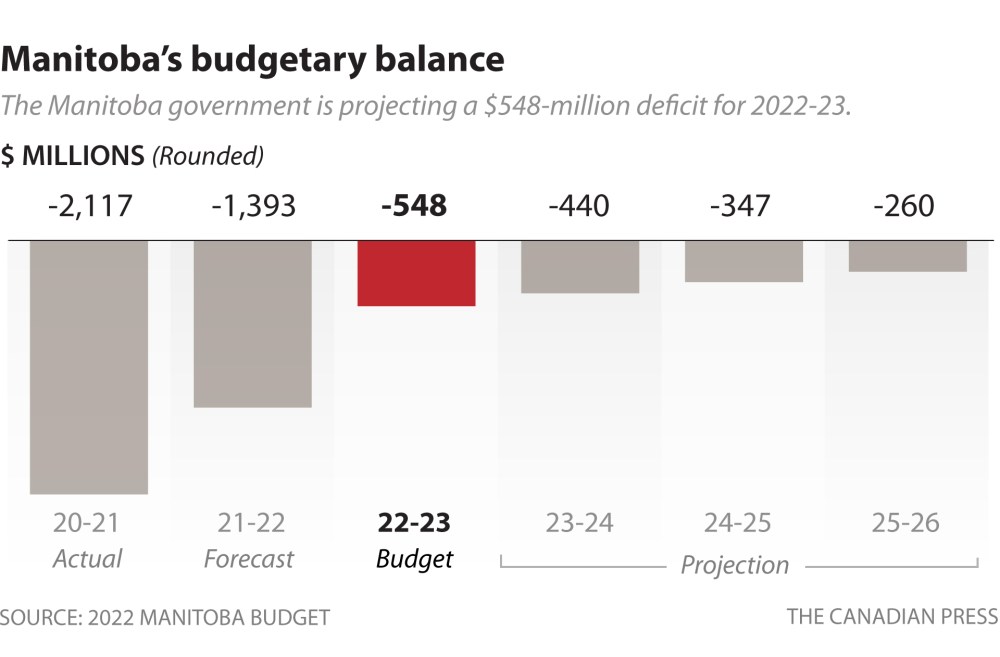 The deficit, meanwhile, is expected to fall to $548 million from $1.6 billion projected in last year’s budget. The actual deficit for 2021-22 was $1.4 billion, Friesen said Tuesday.
