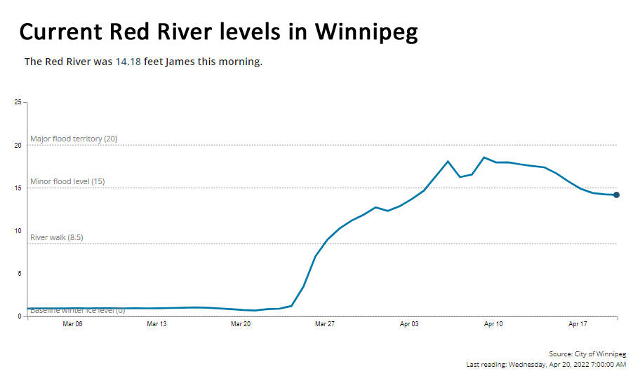 Within Winnipeg, Unduche said the Red River could peak at between 17 and 19 ft., with the Red River Floodway and Portage Diversion in operation. On April 9, the river crested at 18.55 ft. at James Avenue.