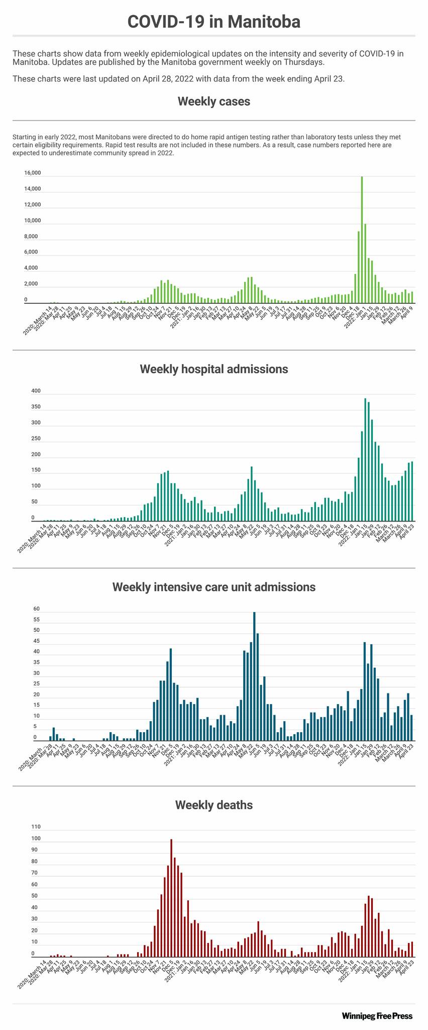 The province’s epidemiological report for April 17 to April 23 showed 12 of the 200 hospitalizations were intensive-care admissions. That’s compared to 206 hospitalizations, 22 ICU admissions, and 12 deaths during the previous week, from April 10 to 16.