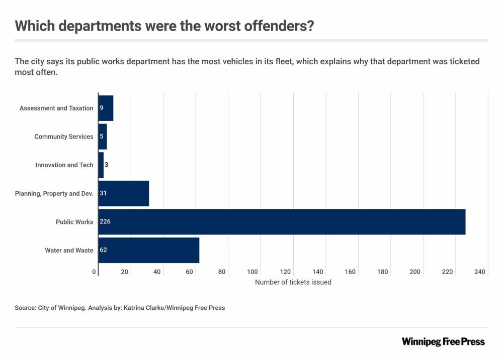 Public works vehicles racked up the most infractions, with 226 — two thirds of the total 336 violations — followed by water and waste with 62 and planning, property and development with 31. Public works, with 820 vehicles, makes up the bulk of the roughly 1,300 non-emergency vehicles in the city’s fleet.