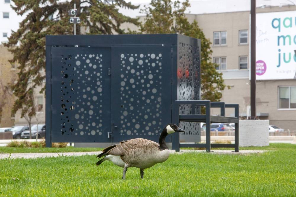 The provincial government has installed a sound-emitting device at one corner of the park to deter Canada geese from nesting in the area or wading into the fountains located between Broadway and York Avenue.
