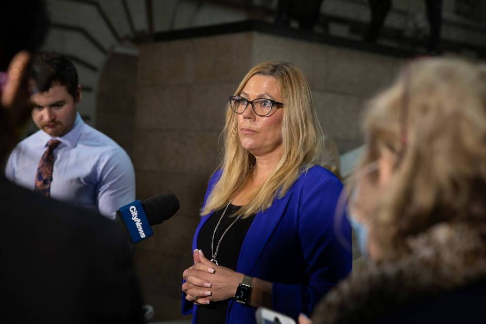 JESSICA LEE / WINNIPEG FREE PRESS Families Minister Rochelle Squires speaks to media during a scrum on May 30, 2022 at the Manitoba Legislative Building. Reporter: Danielle Da Silva