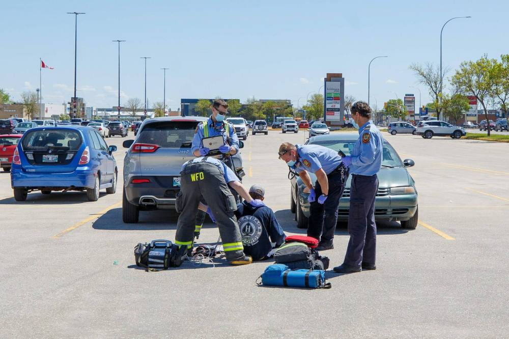 In the southwest corner of the Kildonan Place shopping centre parking lot, a team of Winnipeg Fire Paramedic Service members rush to administer Narcan to a man collapsed on the pavement.