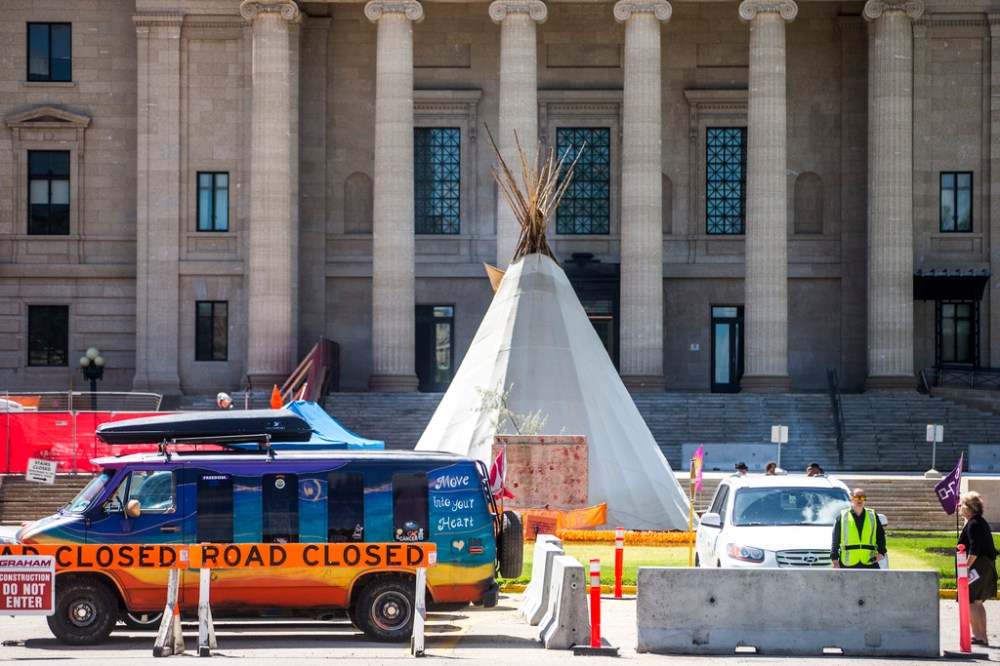 Two weeks ago, a small group connected to the “freedom convoy” erected a giant teepee near where the statue had been located, to the puzzlement of Manitoba First Nations leadership.