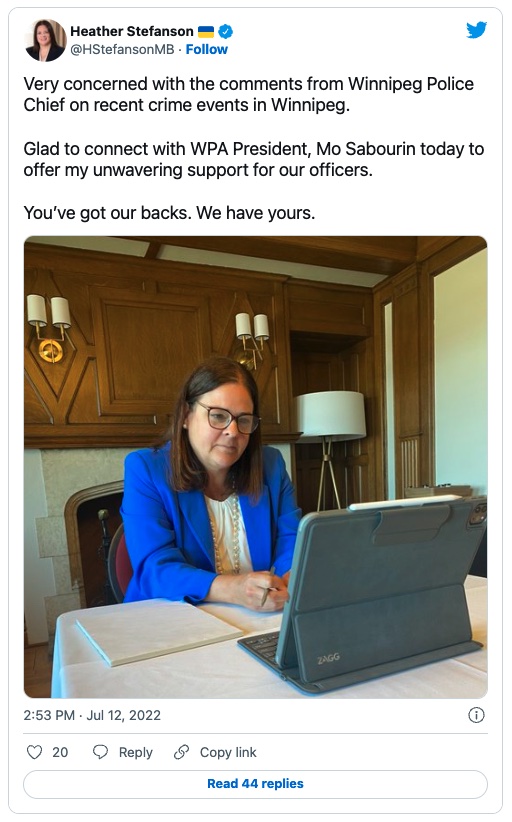 “Very concerned with the comments from Winnipeg police chief on recent crime events in Winnipeg,” Stefanson posted. “Glad to connect with WPA president Mo Sabourin today to offer my unwavering support for our officers. You’ve got our backs. We have yours.”
