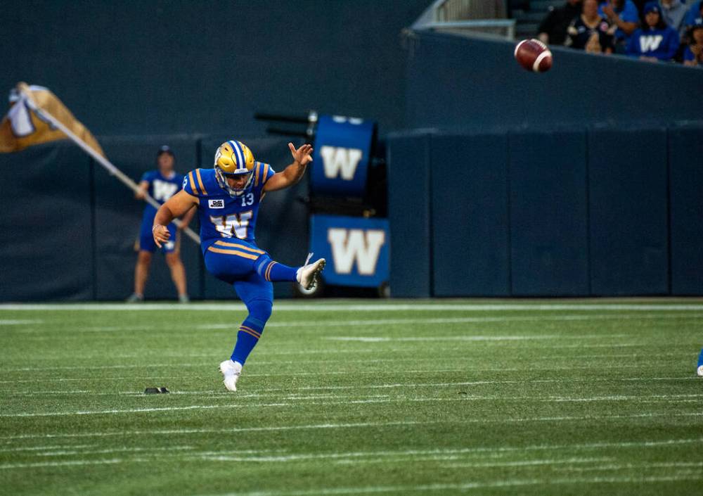 ETHAN CAIRNS / WINNIPEG FREE PRESS Winnipeg Blue Bombers’ kicker Marc Liegghio punts to the Montreal Alouettes during the first half.