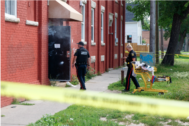 Winnipeg police have yet to arrest anyone for the slaying of a 36-year-old woman or the assaults on three men in Point Douglas Monday.