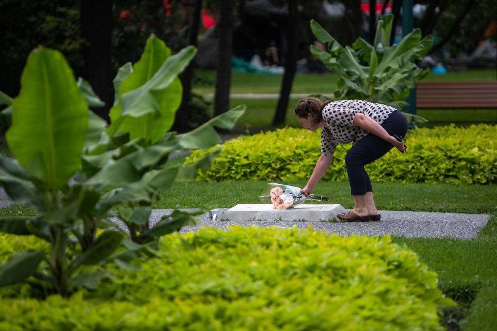 DANIEL CRUMP / WINNIPEG FREE PRESS A person places flowers at the base of where a statue of Queen Elizabeth II once stood in the Queen Elizabeth II gardens next to Government House of Manitoba.