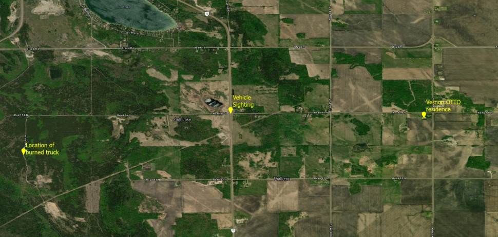 At about 4:50 p.m., his truck was spotted travelling southbound on Highway 12 before turning west onto Road 94 North.