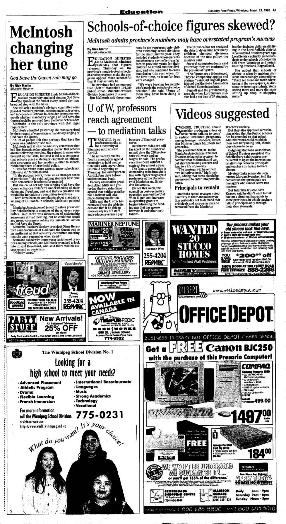 Throughout the 1997-98 and 1998-99 school years, debate over whether or not Manitoba schools should have to play God Save the Queen made headlines in the Free Press.