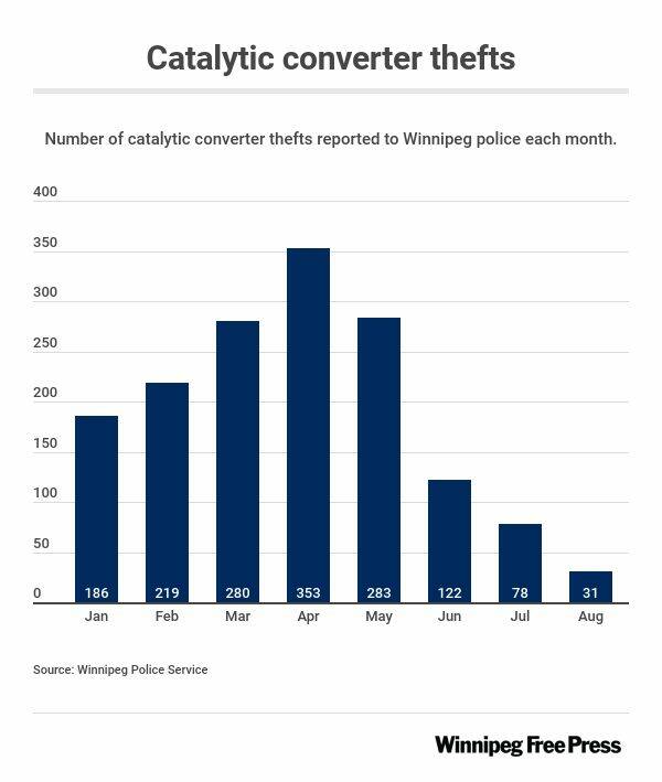 Winnipeg police said Tuesday only 31 catalytic converters were stolen in August, down from 78 in July. That compares to 353 in April and 283 in May. Thieves cut out the part, which is valuable because it contains precious metals, from the underside of vehicles and sell it to scrap yards.