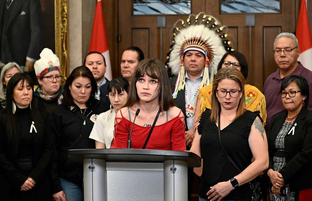 JUSTIN TANG / THE CANADIAN PRESS Cambria Harris started her address to the media by explaining how she is “heartbroken and utterly shocked” by what is happening to Indigenous people. She called for an end to violence against Indigenous women, girls and LGBTTQ+ people