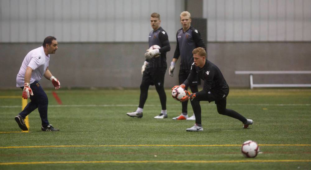 Valour FC goaltending coach Patrick Di Stefani (left) practises drills with the club’s netminders from the inaugural 2019 season. De Stefani said Tuesday of Valour folding that job insecurity comes with the industry.