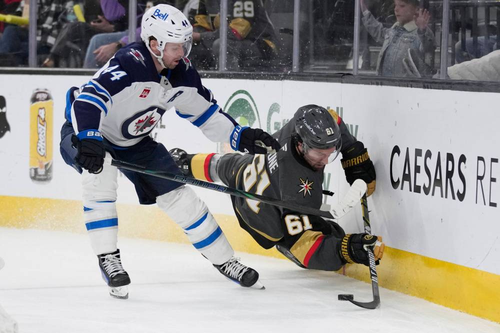 Winnipeg Jets defenceman Josh Morrissey (44) checks Vegas Golden Knights right wing Mark Stone (61) during the second period of an April 2025 game in Las Vegas. Both are set to represent Team Canada at the Olympics.