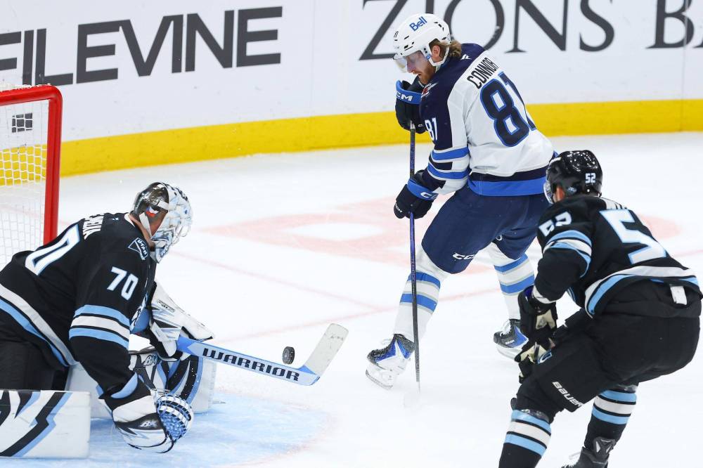 Winnipeg Jets’ Kyle Connor scores on Utah Mammoth goaltender Karel Vejmelka in the second period.