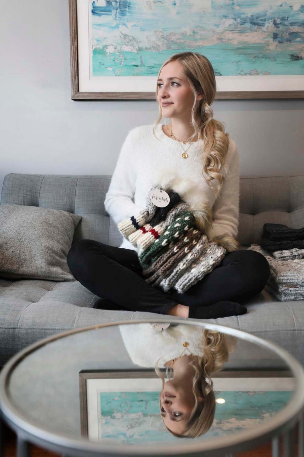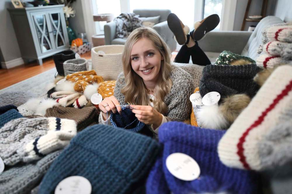 Seated at a table for two, Myska sets forth that her flourishing company, Knits N’ Knots — knitsnknots.ca. — got off the ground three years ago when the then-21-year-old was a student of Food Science at the University of Manitoba. Around that time, her mother bestowed upon her a plastic, circular knitting loom on which she speedily churned out roughly 50 simple woolly tuques.