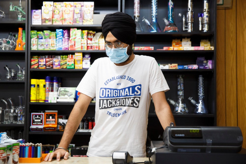 On Monday morning, as a potential customer approaches the store, Singh slaps the sign against the locked glass door. The person goes back to their truck, grabs a mask, and is only then able to come in and shop (later purchasing soft drinks).