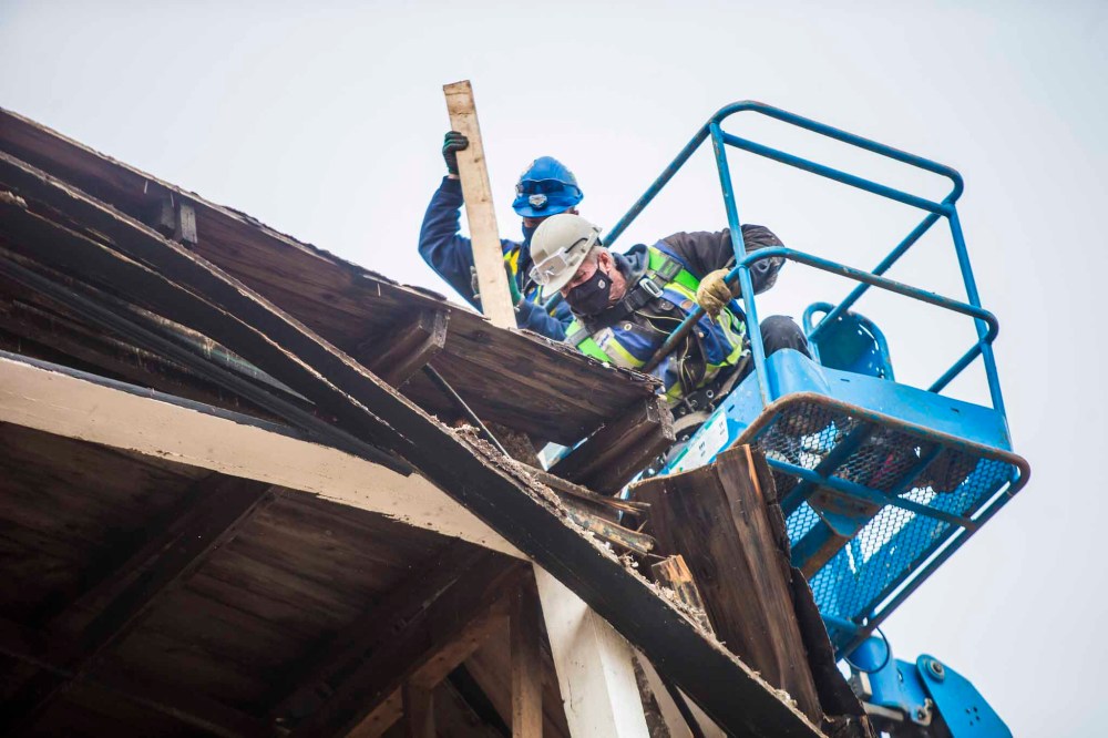 Construction crews have been on site since the beginning of April. Friday morning, they were removing rotten wood from the river-facing balconies.