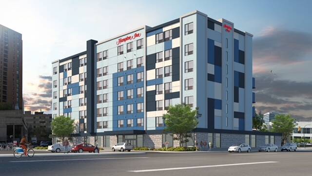 Picture a taller building (by two storeys). More guest suites, less meeting rooms. And, of course, a name change: the Hampton Inn by Hilton.
