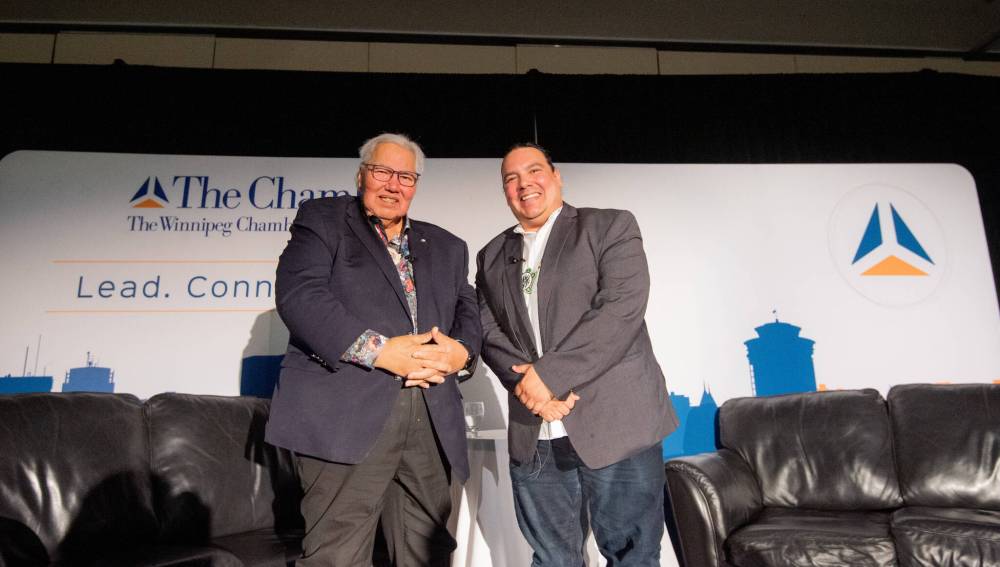 The father-son duo spoke about reconciliation to a crowd of over 600 business professionals — the largest Winnipeg Chamber event since COVID-19 began, excluding state of city and province addresses.