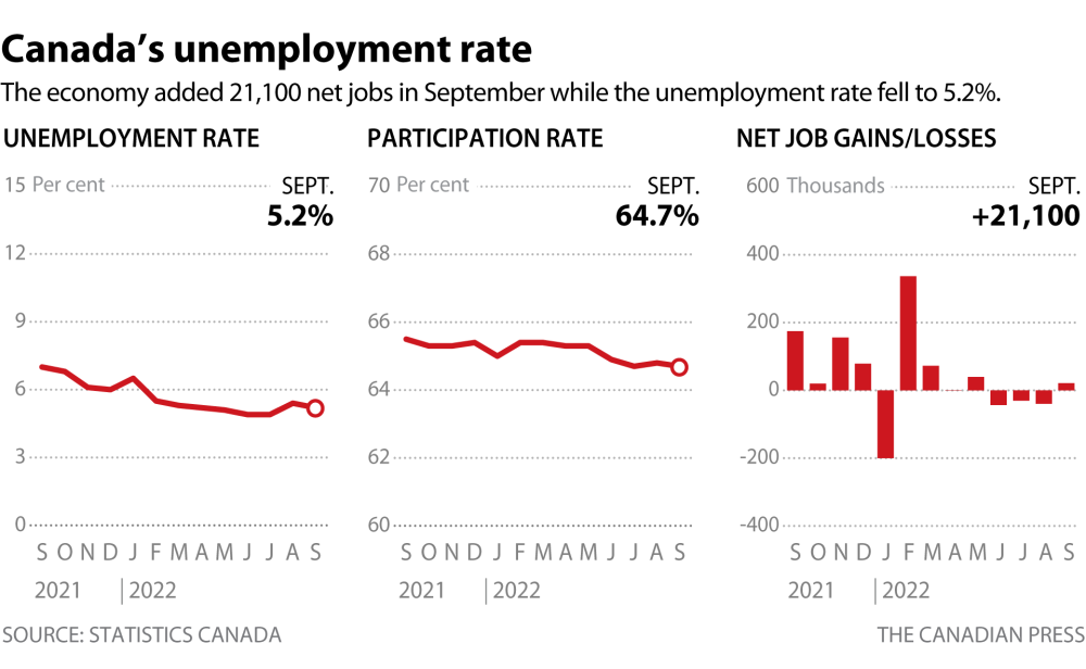 The unemployment rate for the month fell to 5.2 per cent as fewer people looked for work, down from 5.4 per cent in August, Statistics Canada reported in its labour force survey released on Friday. Meanwhile,the economy added 21,000 jobs.