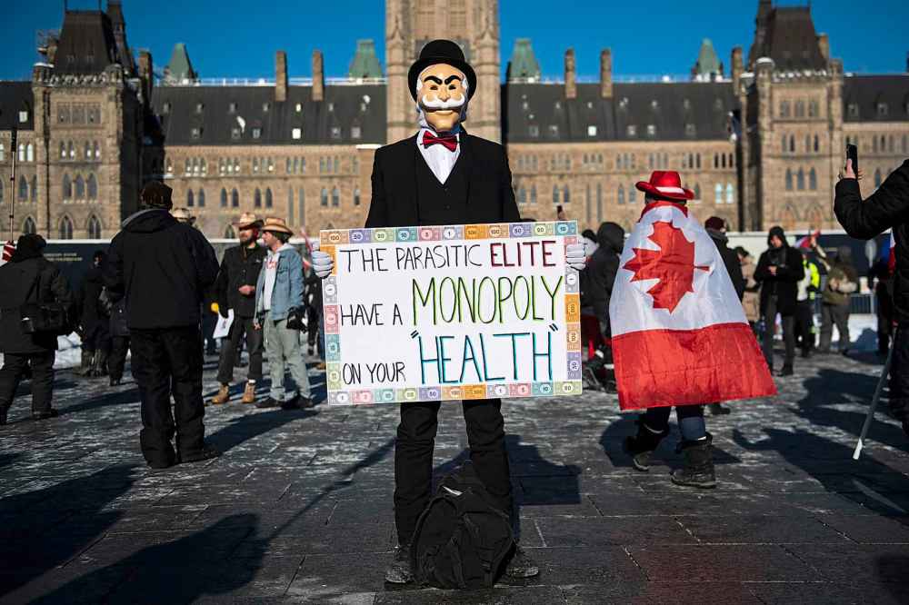 In this photo taken using a drone, vehicles of the protest convoy are seen parked on the Sir John A. Macdonald parkway leading in to downtown Ottawa, Sunday, Jan. 30, 2022. Residents of the national capital are again being told to avoid travelling downtown as a convoy of trucks and cars snarl traffic protesting government-imposed vaccine mandates and COVID-19 restrictions. (ADRIAN WYLD / THE CANADIAN PRESS)A helicopter emblazoned with an expletive against Prime Minister Justin Trudeau flies low over East Block and Parliament Hill. (Justin Tang / The Canadian Press)Protesters stand in front of Centre Block at Parliament Hill protesting measures taken by authorities to curb the spread of COVID-19. (Adrian Wyld / The Canadian Press)A person wearing a Monopoly Man mask holds a sign during a rally against COVID-19 restriction. (Justin Tang / The Canadian Press)Protesters participating in a cross-country truck convoy protesting measures taken by authorities to curb the spread of COVID-19 and vaccine mandates gather near Parliament Hill in Ottawa on Saturday, Jan. 29, 2022. THE CANADIAN PRESS/Adrian WyldTrucks reached Parliament Hill as part of a convoy protesting measures taken by authorities to curb the spread of COVID-19. (Adrian Wyld / The Canadian Press)A counter protester holds a sign promoting vaccines as others wave flags during a rally against COVID-19 restrictions on Parliament Hill. (Justin Tag / The Canadian Press)Supporters wave signs and flags on an overpass in Kanata, Ont., just as they wait for a trucker convoy making it's way to Parliament Hill in Ottawa. (Frank Gunn / The Canadian Press)CP
