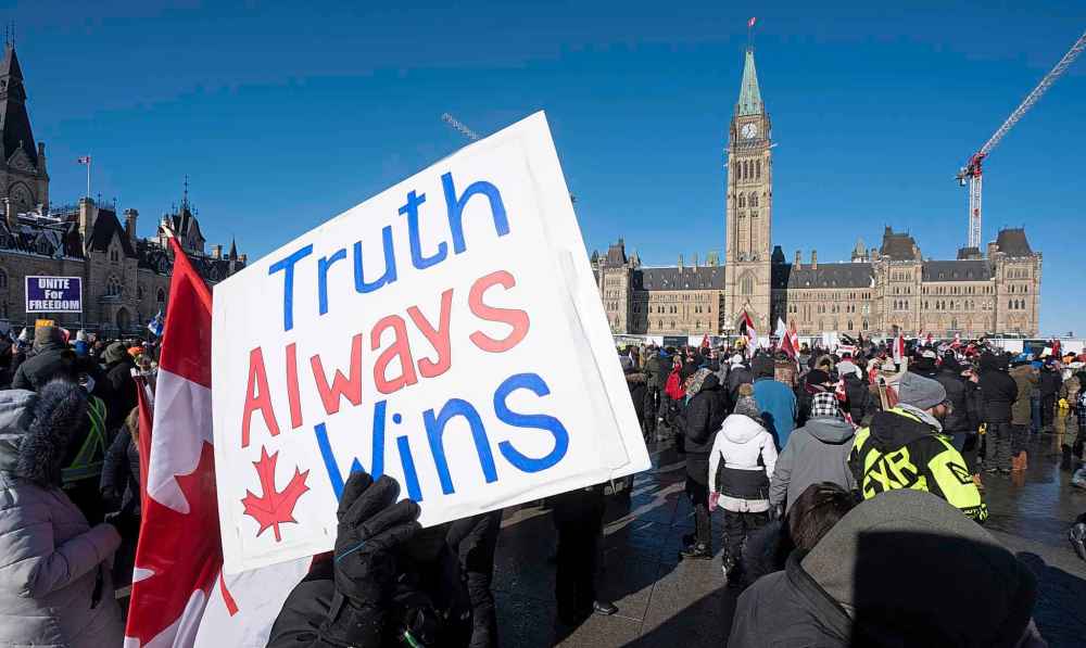 Supporters wave flags on an overpass in Kanata, Ont., as a trucker convoy making it's way to Parliament Hill in Ottawa to participate in a cross-country truck convoy protesting measures taken by authorities to curb the spread of COVID-19 and vaccine mandates passes by on Saturday, Jan. 29, 2022. (FRANK GUNN / THE CANADIAN PRESS)Protesters hold signs thanking truckers and promoting freedom of choice on Parliament Hill. (Adrian Wyld / The Canadian Press)People surround the Tomb of the Unknown Soldier at the National War Memorial during a rally against COVID-19 restrictions in Ottawa, which began as a cross-country convoy protesting a federal vaccine mandate for truckers, on Sunday, Jan. 30, 2022. THE CANADIAN PRESS/Justin TangA statue of Terry Fox is defaced with an upside down Canadian flag and a protest sign as demonstrators participating in a cross-country truck convoy protest measures taken to curb the spread of COVID-19 by gathering on Parliament Hill in Ottawa on Saturday, Jan. 29, 2022. A British Columbia mayor says the defacing of a statue has ignited disbelief among residents in the national hero's hometown, and he's calling on them to channel their frustration into doing something positive. THE CANADIAN PRESS/Adrian WyldProtesters participating in a cross-country truck convoy protesting measures taken by authorities to curb the spread of COVID-19 and vaccine mandates walk near Parliament Hill. (Adrian Wyld / The Canadian Press)CP