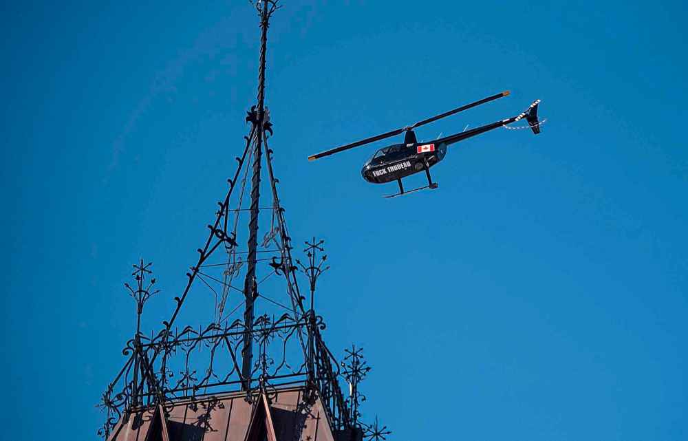 A helicopter with its underbody emblazoned with an expletive against Prime Minister Justin Trudeau flies low over Parliament Hill during a rally against COVID-19 restrictions, which began as a cross-country convoy protesting a federal vaccine mandate for truckers, in Ottawa, on Saturday, Jan. 29, 2022. (JUSTIN TANG / THE CANADIAN PRESS)Trucks are parked on Metcalfe Street as a rally against COVID-19 restrictions, which began as a cross-country convoy protesting a federal vaccine mandate for truckers, continues in Ottawa, on Sunday, Jan. 30, 2022. THE CANADIAN PRESS/Justin TangNathan (Jacko) Jack, an Australian living in Toronto, waves flags in front of trucks that are parked in front of Parliament Hill as a rally against COVID-19 restrictions, which began as a cross-country convoy protesting a federal vaccine mandate for truckers, continues in Ottawa, on Monday, January 31, 2022. THE CANADIAN PRESS/ Patrick DoyleTrucks are parked on Metcalfe Street as a rally against COVID-19 restrictions, which began as a cross-country convoy protesting a federal vaccine mandate for truckers, continues in Ottawa, on Sunday, Jan. 30, 2022. Police haven't reported any violence at the ongoing Ottawa rally against vaccine mandates and other government-imposed COVID-19 restrictions, but critics warn that conflating the absence of bloodshed with "peaceful" protest downplays the dangers of this weekend's demonstration. THE CANADIAN PRESS/Justin TangA man who removed the tires from his pickup truck stands in front of West Block on Parliament Hill as a rally against COVID-19 restrictions, which began as a cross-country convoy protesting a federal vaccine mandate for truckers, continues in Ottawa, on Monday, January 31, 2022. THE CANADIAN PRESS/ Patrick DoyleCP