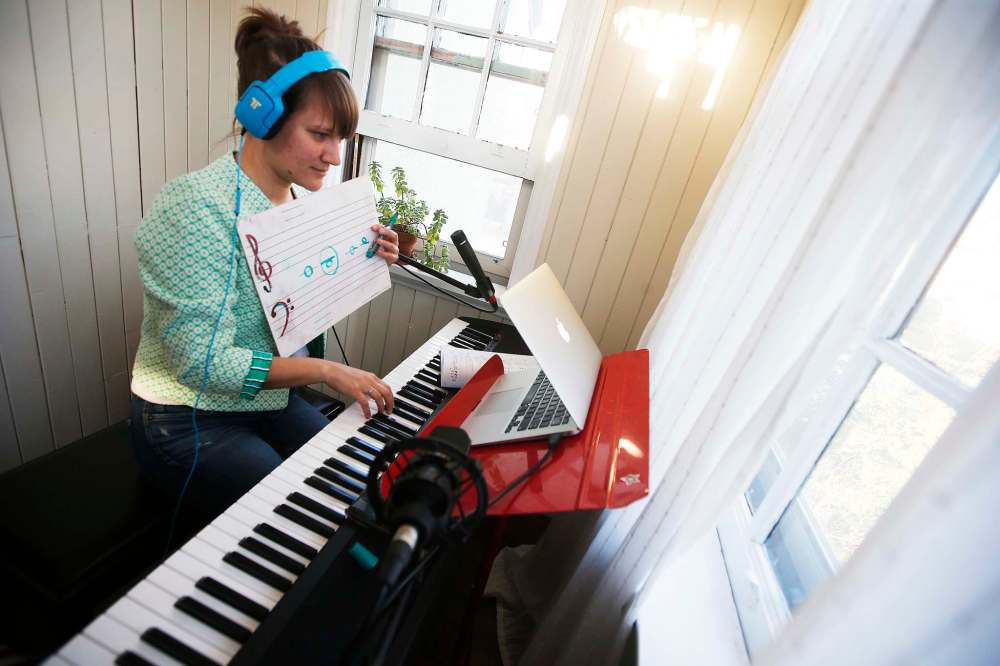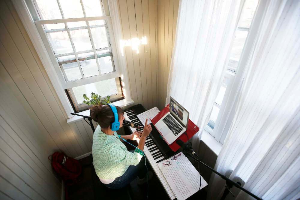 Hildebrand has set up her keyboard in her home's tiny second-floor porch and communicates with students through her laptop propped up on a music stand. (John Woods / Winnipeg Free Press)