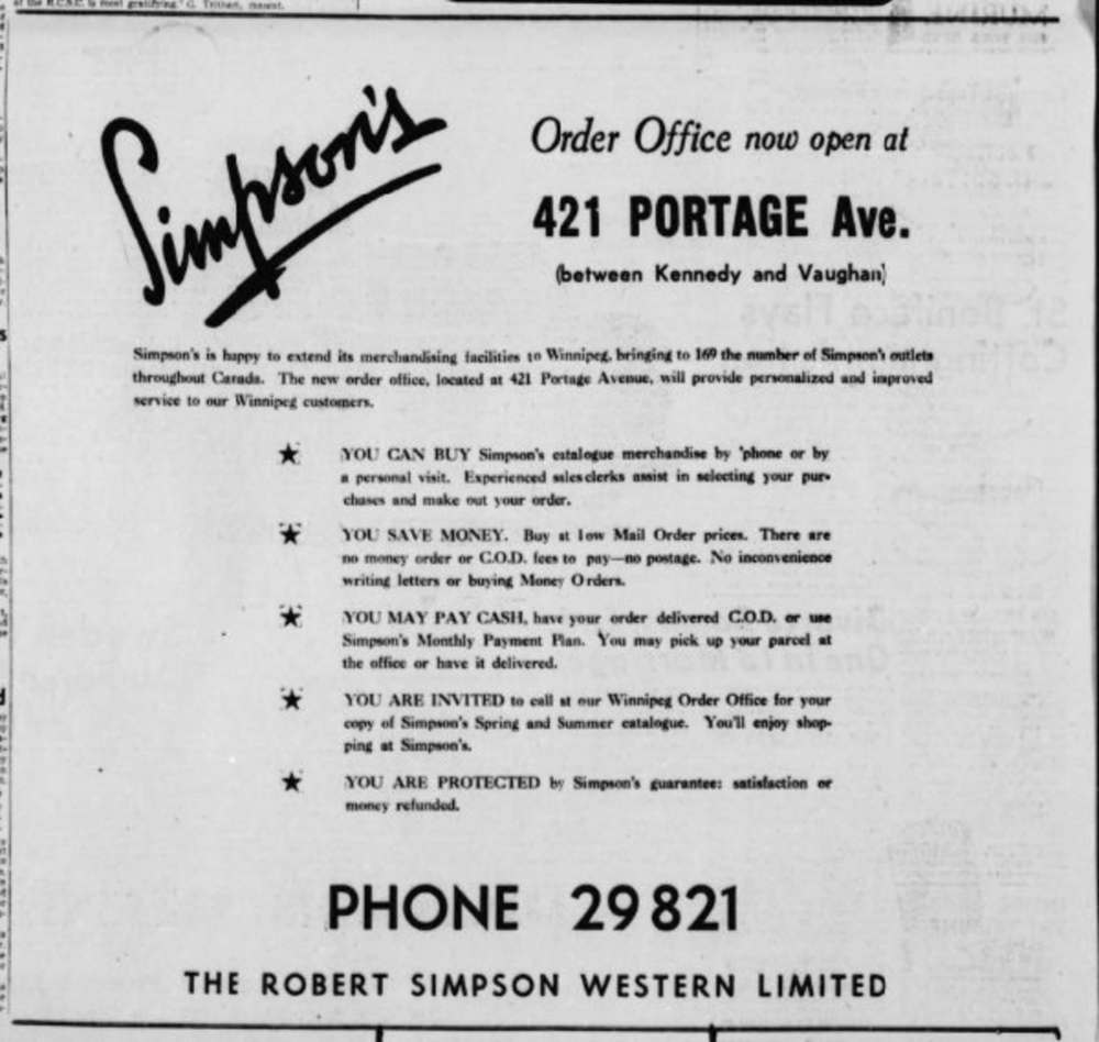 Sears’ bricks-and-mortar presence in Winnipeg can be traced back to 1948, when Toronto-based department store chain The Robert Simpson Company, or “Simpson’s”, opened a catalogue mail-order office on Portage Avenue at Vaughan Street kitty-corner from the Hudson’s Bay Company’s flagship store.
