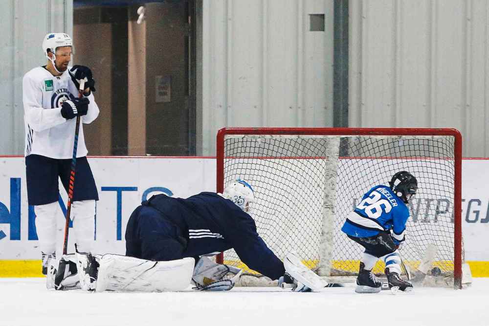 Winnipeg Jets' Blake Wheeler looks on as his son Louie scores on goaltender Laurent Brossoit after practice Monday, October 8, 2018.JOHN WOODS / WINNIPEG FREE PRESS