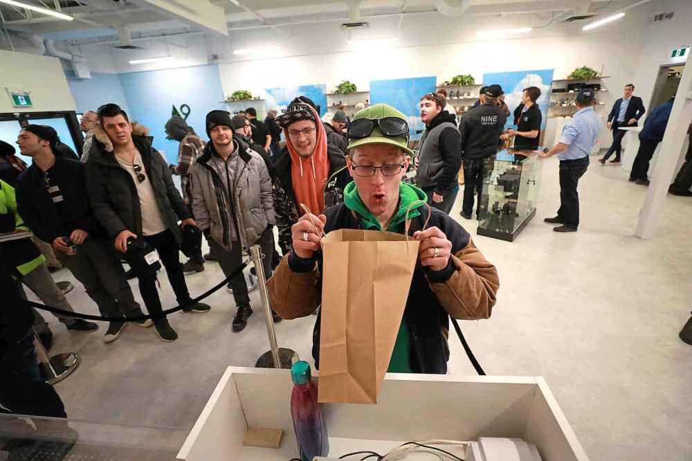Delta 9's first customer, Steven Stairs, shows his excitement as he purchases his first order of cannabis at the store on Dakota Street Wednesday, October 17 2018. Stairs had camped out in his tent Tuesday evening.MIKE DEAL / WINNIPEG FREE PRESS