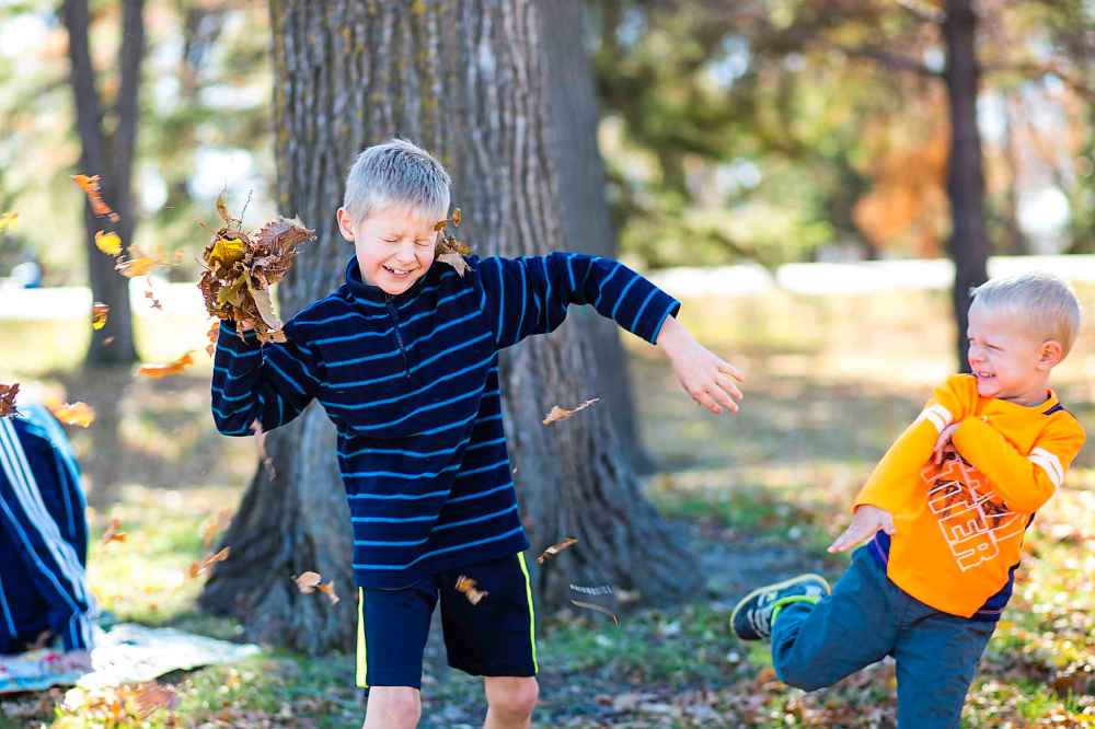 Toby Wohlgemut (left) and his brother, Eddy, throw leaves at each other in St. Vital Park in Winnipeg Thursday, October 18, 2018.RUTH BONNEVILLE / WINNIPEG FREE PRESS