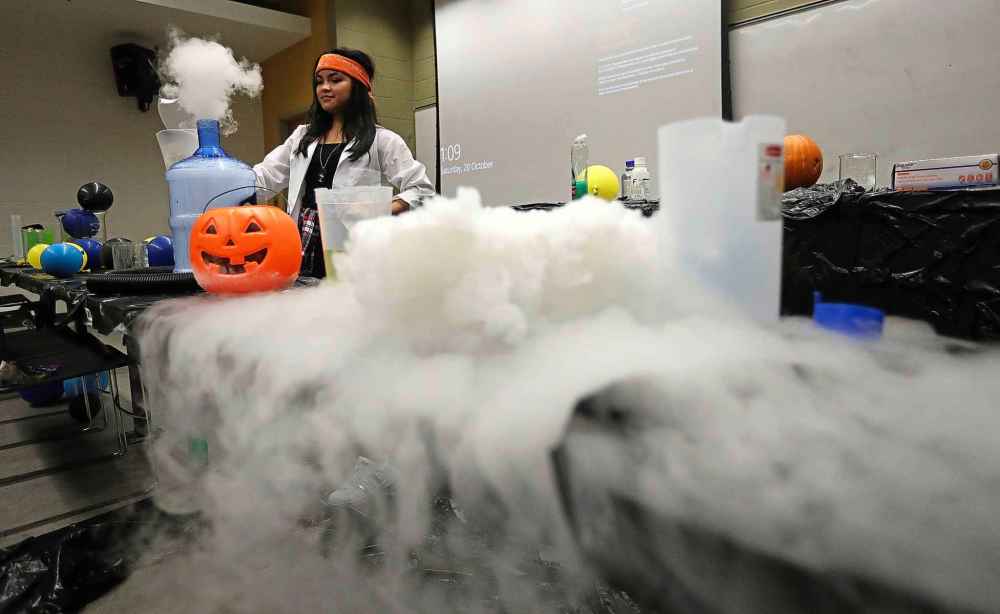 Kristine Macalinao, assistant coordinator for Let's Talk Science, and a fourth-year genetics student performing a magic show during the Spooky Science event at the University of Manitoba, Saturday, October 20, 2018.RUTH BONNEVILLE / WINNIPEG FREE PRESS