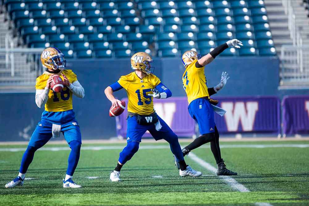 Quarterbacks Bryan Bennett (left), Matt Nichols, and Chris Streveler at Bombers practice at Investors Group Field in Winnipeg Monday, October 22, 2018.MIKAELA MACKENZIE / WINNIPEG FREE PRESS