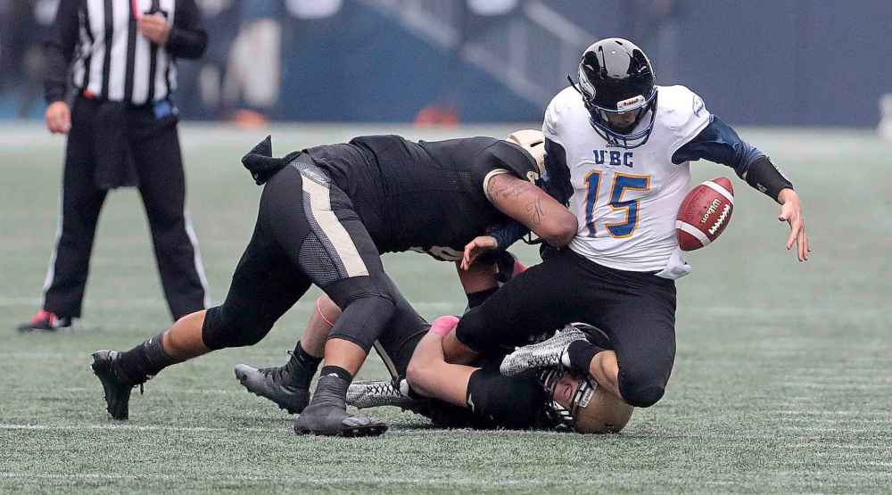 Manitoba Bisons defensive end Kent Hicks (4) and defensive lineman Brock Gowanlock (9) sack UBC Thunderbirds quarterback Michael O'Connor, causing him to lose the ball, Saturday, October 27, 2018.JOHN WOODS / WINNIPEG FREE PRESS