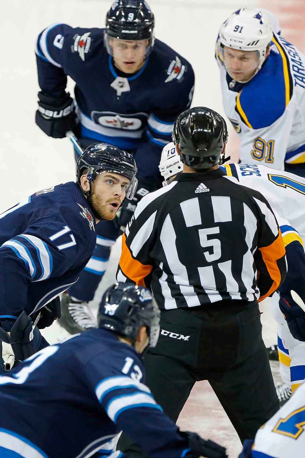 Winnipeg Jets' Adam Lowry (17) reacts to the referee during first period NHL action against the St. Louis Blues in Winnipeg on Monday, October 22, 2018.JOHN WOODS / WINNIPEG FREE PRESS