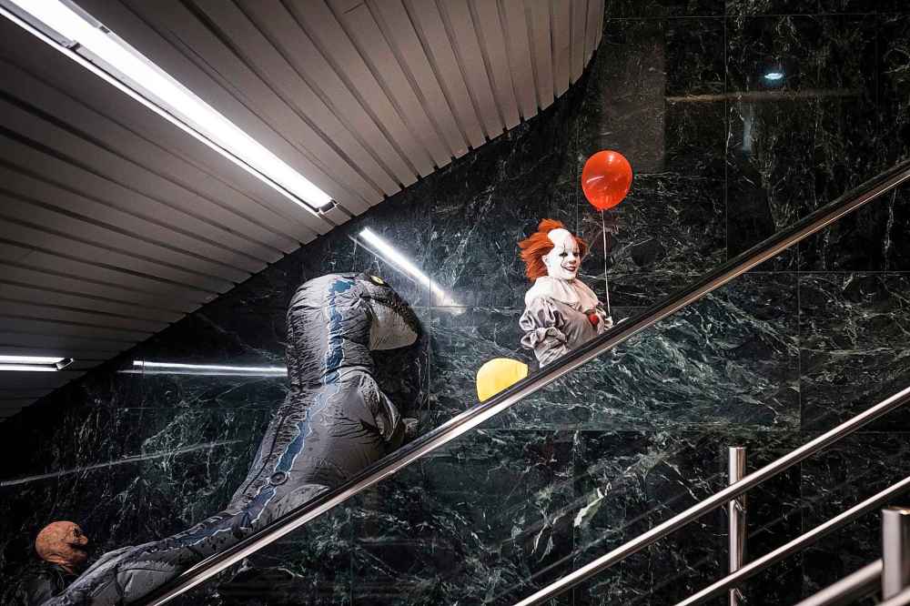 Pennywise the clown, Georgie and a dinosaur ride an escalator to the third floor of the RBC Convention Centre to attend the Central Canada Comic Con, Saturday, October 27, 2018. The three characters are a sight that might not make much sense anywhere else but at a comic con.MIKAELA MACKENZIE / WINNIPEG FREE PRESS