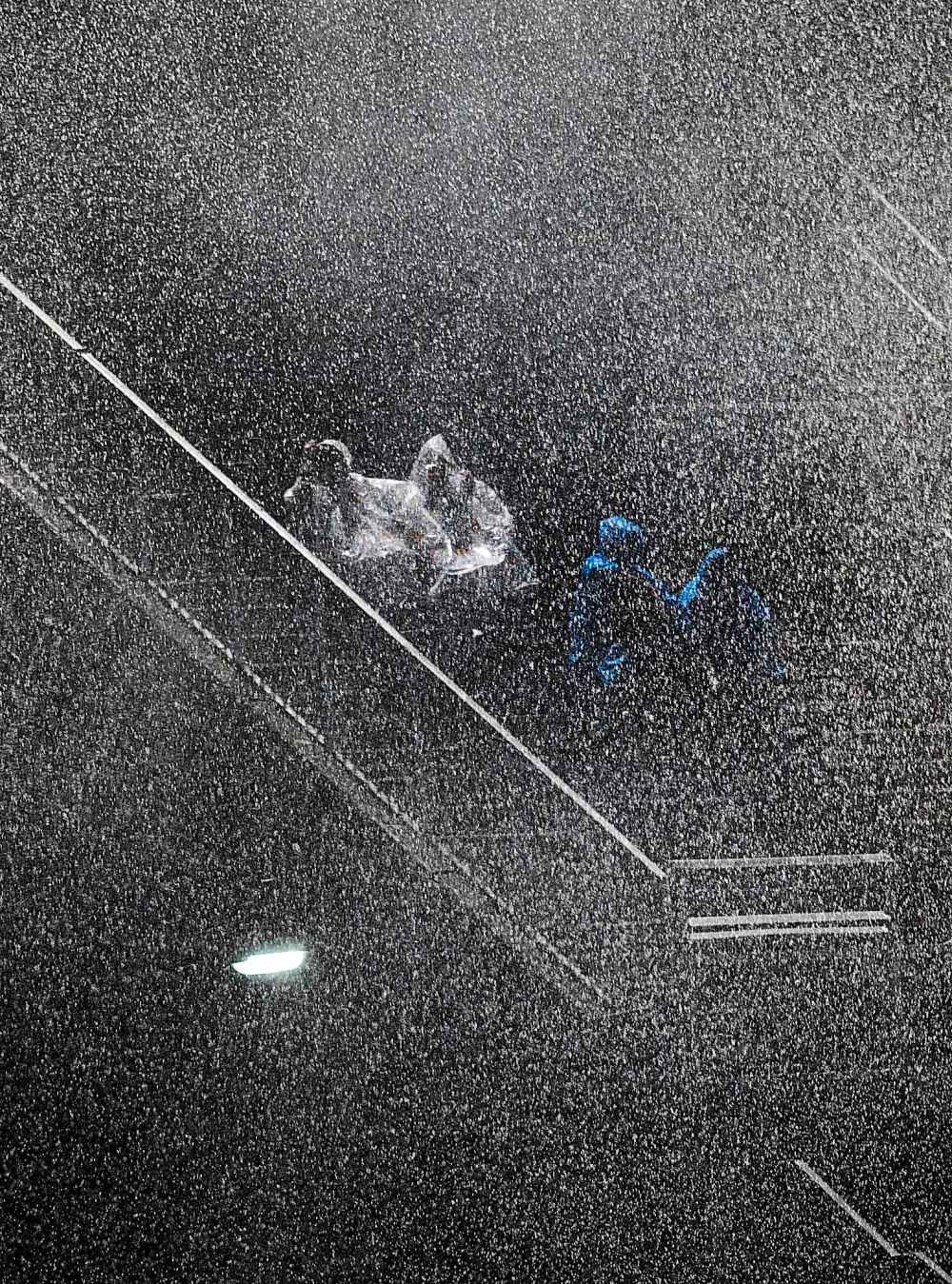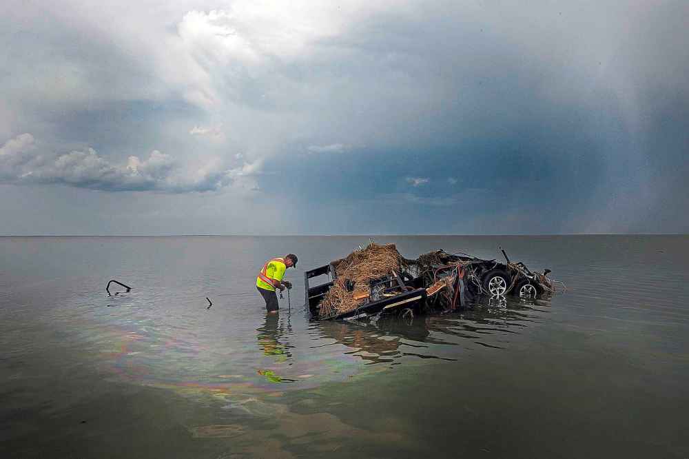 August 7 — Surrounded by an oily sheen while a squall blows across lake Manitoba behind him, Daniel Cottyn attaches a tow line to the wreckage of a camper in Lake Manitoba at the Margaret Bruce Beach and campground. A tornado ripped through the Alonsa, Manitoba area Friday.PHIL HOSSACK / WINNIPEG FREE PRESS