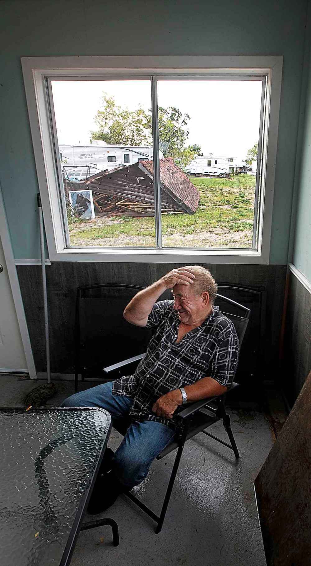 August 7 — Sitting in the Margaret Bruce Beach office and campground store with the wreckage of a camper over his right shoulder, Jimmy Bruce laughs at himself in hindsight for staying in the structure as a tornado destroyed the family campground Friday.MIKAELA MACKENZIE / WINNIPEG FREE PRESS