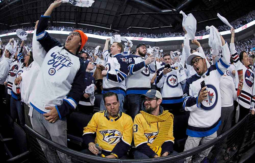 May 1 — Nashville Predators' fans Ash Greyson, left, and Ryan Dunlap are surrounded by cheering Winnipeg Jets' fans after Jets' Dustin Byfuglien (33) scores during second period NHL round two game three playoff action in Winnipeg.PHIL HOSSACK / WINNIPEG FREE PRESS