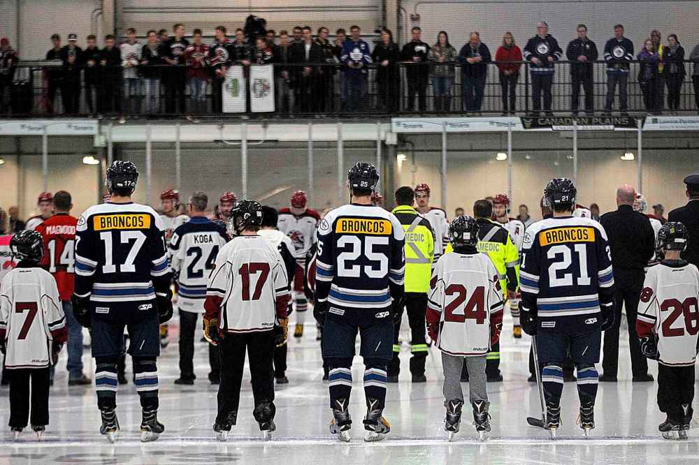 April 12 — Steinbach Pistons and the Virden Oil Capitals wear "Broncos" as a tribute to the Humbolt Broncos at the Virden Tundra Oil Gas Place Thursday evening.MIKE DEAL / WINNIPEG FREE PRESS
